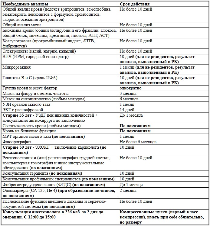 Перечень обследования на лапароскопию (пластику, резектоскопию)